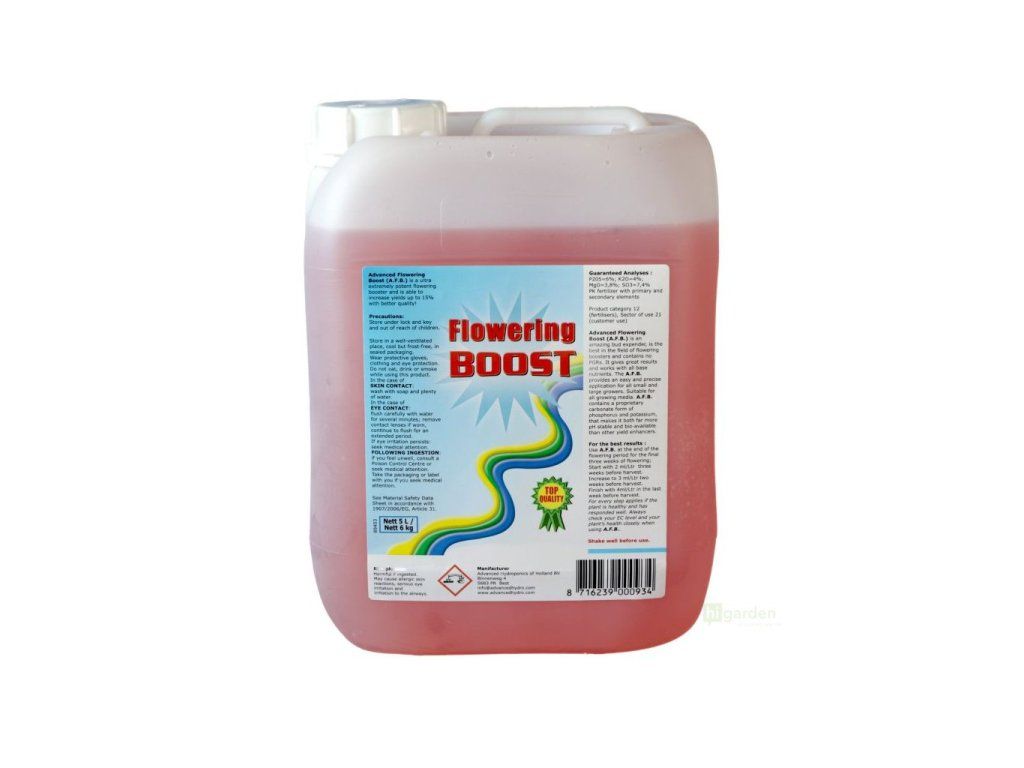 Advanced Hydroponics Flowering Boost (A.F.B.) je úžasný expender poupat, je nejlepší v oblasti boosterů kvetení a neobsahuje žádné PGR. Poskytuje skvělé výsledky a funguje se všemi základními živinami. A.F.B. poskytuje snadnou a přesnou aplikaci pro všechny malé i velké pěstitele. Vhodný pro všechny pěstební substráty. A.F.B. obsahuje patentovanou uhličitanovou formu fosforu a draslíku, díky které je mnohem stabilnější v pH i biologicky dostupnější než jiné látky zvyšující výnos. Pro dosažení nejlepších výsledků : A.F.B. používejte na konci období kvetení po dobu posledních tří týdnů kvetení. Začněte s dávkou 2 ml/l tři týdny před sklizní. Dva týdny před sklizní zvyšte dávku na 3 ml/ltr. Poslední týden před sklizní dokončete dávkou 4 ml/ltr. Pro každý krok platí, že pokud je rostlina zdravá a dobře reaguje. Při používání přípravku A.F.B vždy pečlivě kontrolujte hladinu EC a zdravotní stav rostliny.Doplňkové parametry
