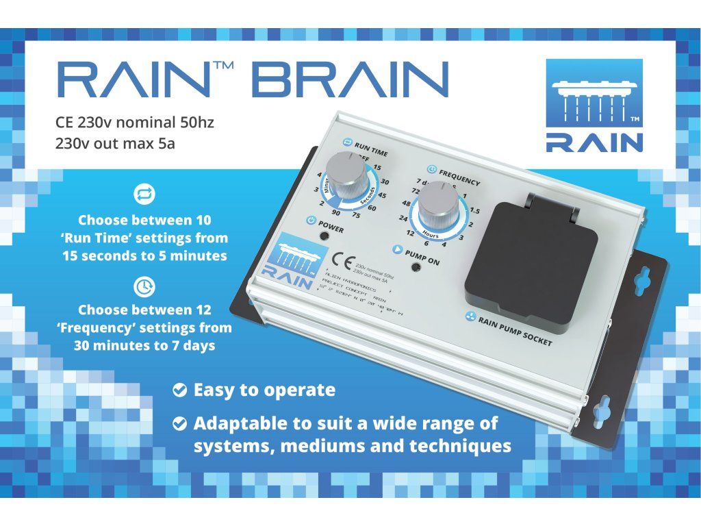 - Zálivka je řízená systémem Rain Brain, umožňuje nastavit trvání zálivky od 15 sekund do 5 minut v intervalu od 30 minut po 7 dní