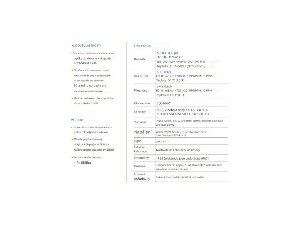 Aqua Master Tools C800 Pro je dokonalým řešením pro řízení kvality vody a hladiny živin v pěstebním nebo vodním systému. Průběžně monitoruje a reguluje pH a EC a měří teplotu, čímž zajišťuje optimální podmínky za všech okolností. Tento pokročilý regulátor se dodává s elektrodami pH a EC a sadou napájecího adaptéru. Regulátor můžete používat samostatně nebo s naší aplikací, která je k dispozici pro systémy Android a iOS. Přizpůsobte si nastavení pomocí modulárních čerpadel, která podporují až pět čerpadel pro dávkování EC a jedno čerpadlo pro dávkování pH nahoru/dolů. Uložte nastavení dávkování do cloudu pro budoucí použití. Přístup k historickým datům za jeden rok kdykoli a odkudkoli. Obsahuje barevný dotykový displej a kalibrační indikátory pro snadné ovládání. Bezkonkurenční přesnost a flexibilita.Doplňkové parametry