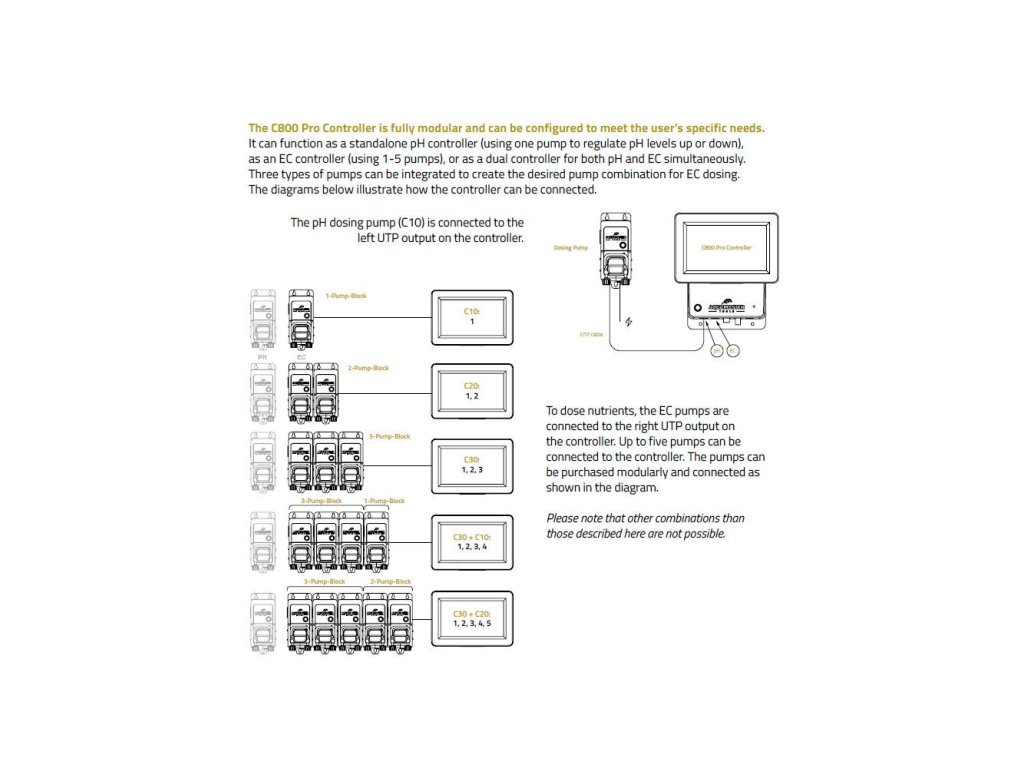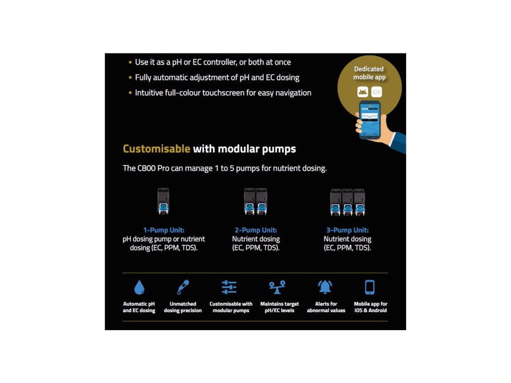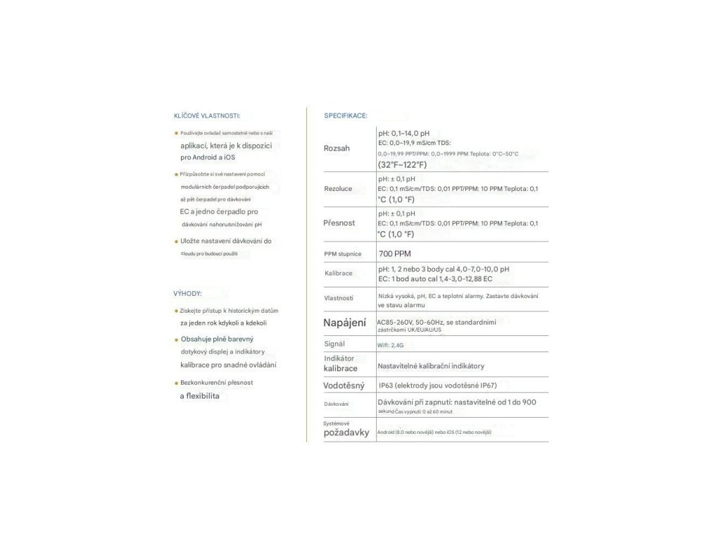 Aqua Master Tools C800 Pro INLINE je dokonalým řešením pro řízení kvality vody a hladiny živin v pěstebním nebo vodním systému. Průběžně monitoruje a reguluje pH a EC a měří teplotu, čímž zajišťuje optimální podmínky za všech okolností. Tento pokročilý regulátor se dodává s elektrodami pH a EC a sadou napájecího adaptéru. Regulátor můžete používat samostatně nebo s naší aplikací, která je k dispozici pro systémy Android a iOS. Přizpůsobte si nastavení pomocí modulárních čerpadel, která podporují až pět čerpadel pro dávkování EC a jedno čerpadlo pro dávkování pH nahoru/dolů. Uložte nastavení dávkování do cloudu pro budoucí použití. Přístup k historickým datům za jeden rok kdykoli a odkudkoli. Obsahuje barevný dotykový displej a kalibrační indikátory pro snadné ovládání. Bezkonkurenční přesnost a flexibilita.Doplňkové parametry