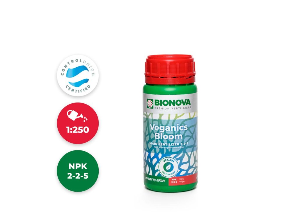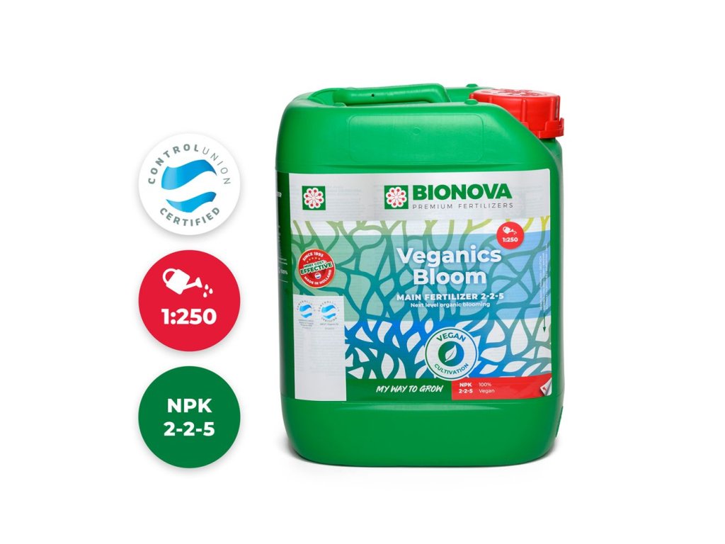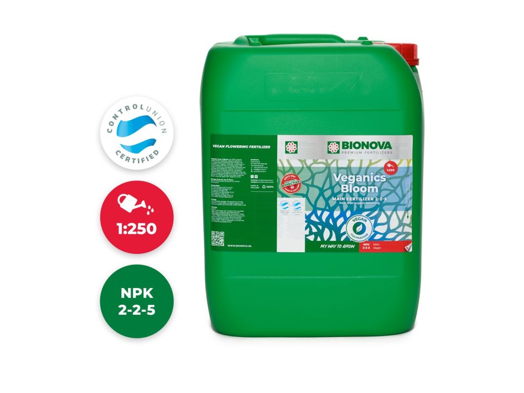 BioNova Veganics Bloom je 100% VEGAN organické hnojivo vyvinuté pro květovou fázi rostlin a certifikované organizací PETERSON CONTROL UNION.