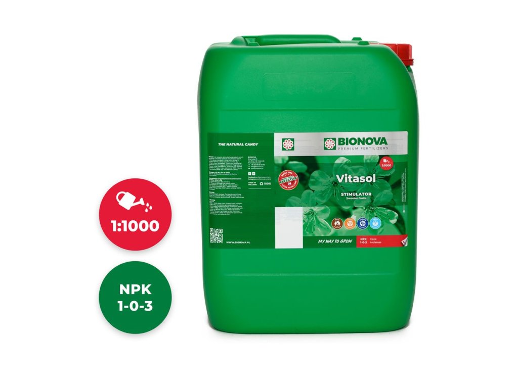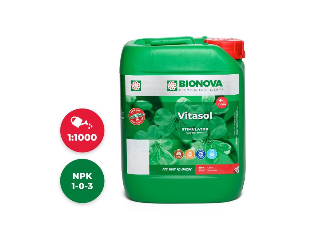 BioNova VitaSol je tekutý organický zlepšovač chuti s vyšším obsahem draslíku a vápníku, který podporuje růst rostlin a poskytuje vysokou odolnost vůči chorobám.