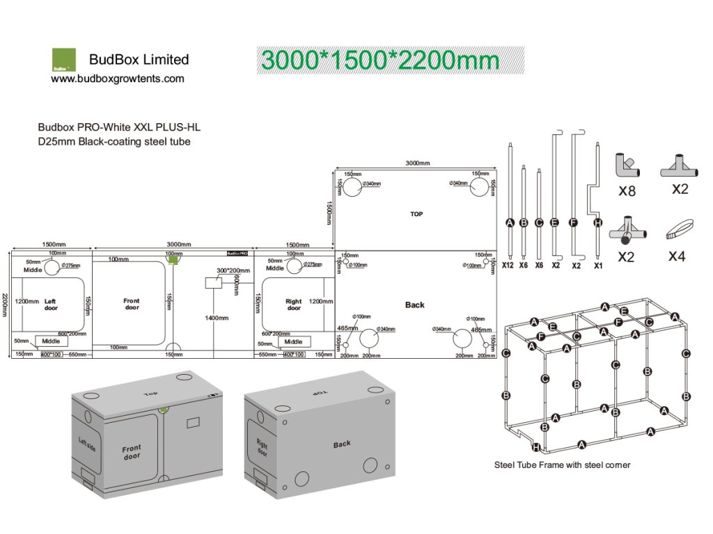 BudBox PRO XXL+ HL 150 je vysoce kvalitní a sofistikovaný pěstební stan s nadstandardní výškou, vyrobený ze 100% neprůsvitného materiálu a kovové konstrukce, s mnoha vylepšeními a unikátním pozorovacím okénkem.