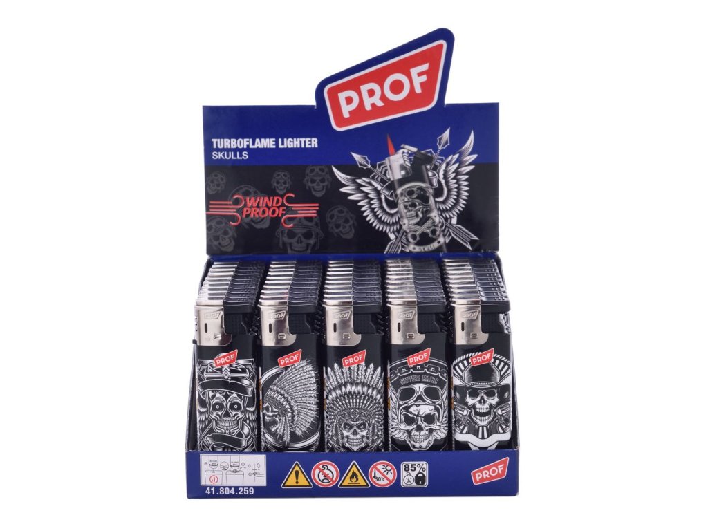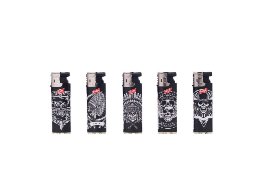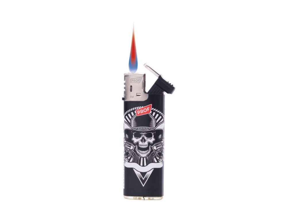 Větruvzdorný turbo zapalovač s nastavitelným plamenem, jednorázově plnitelný, s víčkem, které se při zapálení otáčí, s designem lebek.