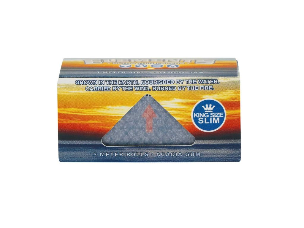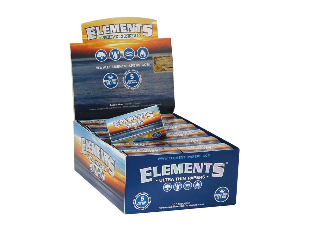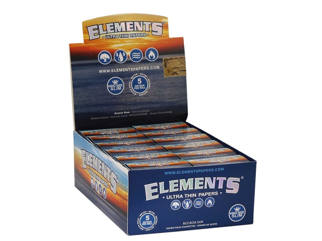 Pomalu hořící, rýžové rolovací papírky Elements Rolls King Size Slim jsou 5 metrů dlouhé. Lepení zajišťuje přírodní guma.