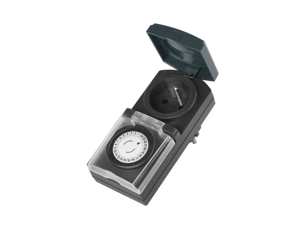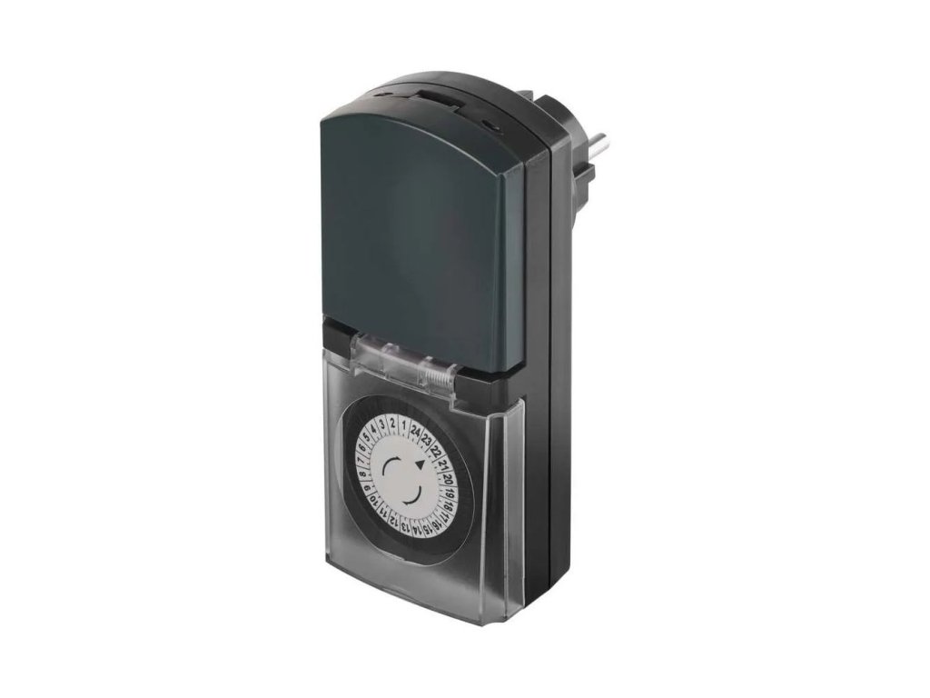 Mechanická spínací zásuvka s 24hodinovým cyklem. Minimální nastavitelný časový úsek je 30 minut. Krytí IP44 umožňuje použití mechanické spínací zásuvky ve venkovních prostorech. Provozní teplota -25 °C do +50 °C.