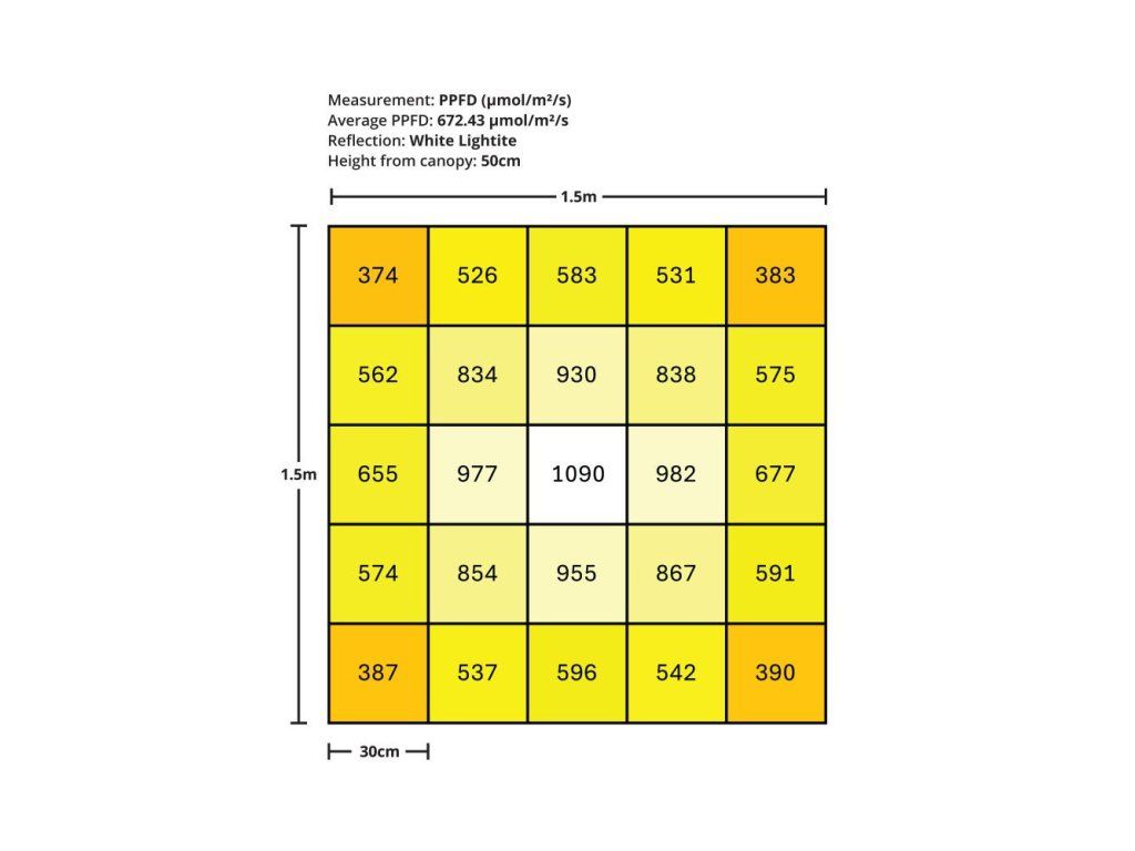 Gorilla 720W LED GEN-III poskytuje 1944 µmol/s plného spektra světla s účinností 2,7 µmol/J a zajišťuje konzistentní a rovnoměrné pokrytí plochy o rozměrech 1,5 × 1,5 m. Konstrukce se 6 tyčemi, s integrovaným stmíváním nebo možností 0–10 V pro externí ovladače a skládací rám pro snadnou instalaci a přepravu. S životností 50 000 hodin a 2letou zárukou je GEN-III spolehlivou volbou pro pěstitele, kteří chtějí cenově dostupnou LED bez kompromisů.