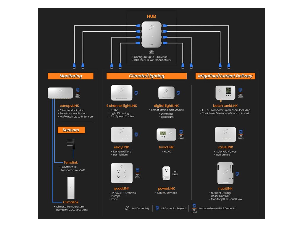 Klimatický senzor Growlink Climalink monitoruje teplotu, vlhkost, světlo, VPD a volitelně CO2 v reálném čase, čímž poskytuje základní údaje pro řízení klimatu v pěstebním prostředí.