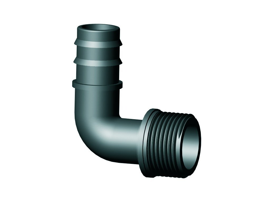 Hadičník s vnějším závitem 3/4" a průměrem 20mm a kolenem.