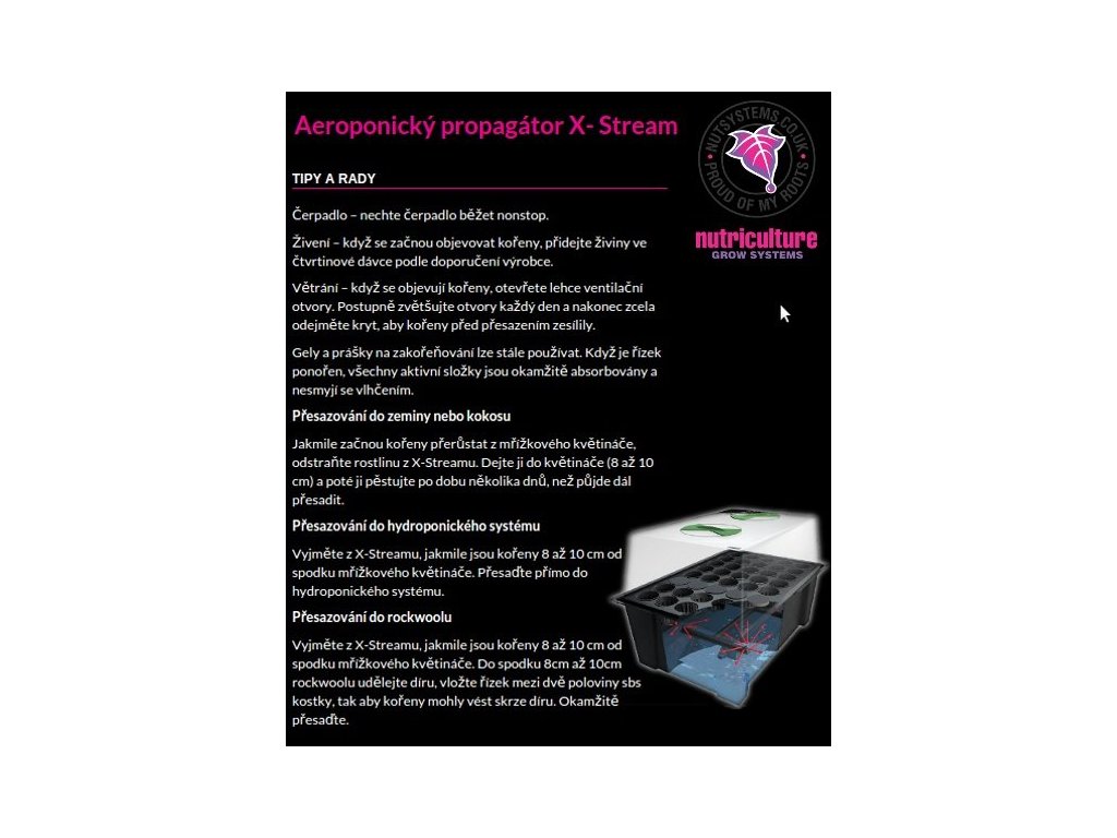 - Kompletní aeroponický propagátor X-Stream 12 obsahuje 15litrovou nádrž, průhledné víko s klapkami, podpůrný tác, mřížkované květináče, límce na řízky, čerpadlo, distribuční systém s tryskami a kompletní návod k použití.