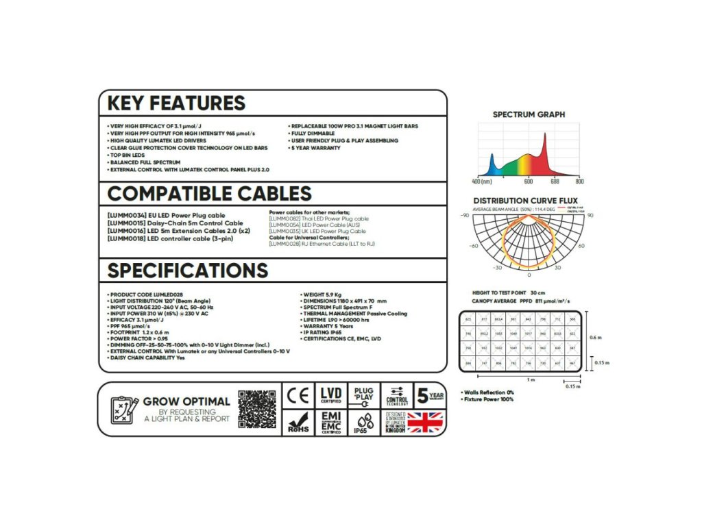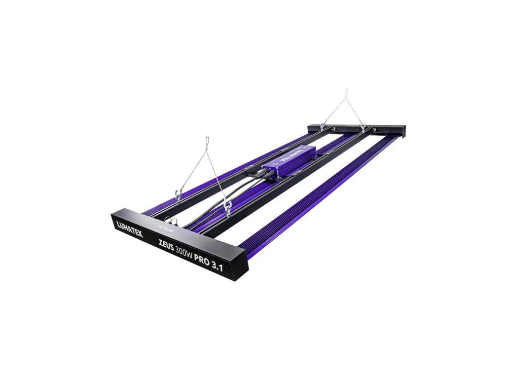 LUMATEK ZEUS 300W PRO 3.1 je výkonné LED pěstební světlo s mimořádnou účinností 3,1 µmol/J a světelným tokem 965 µmol/s, navržené pro pokrytí plochy 1,2 x 0,6 m. Díky rovnoměrnému rozložení světla je ideální jak pro hobby pěstitele, tak pro profesionály, kteří se zaměřují na menší nebo specifické pěstební zóny.