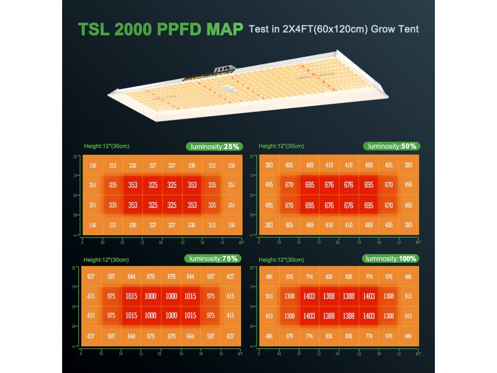 Mars Hydro TSL2000 je LED osvětlení s úhlem lomu světla od 90° do 120° a vylepšeným bílým reflektorem, který umožňuje rostlinám absorbovat více energie ze světla, má nízkou spotřebu 300 W a 778 umol/s a je vhodný pro pěstební prostor 120x60 cm.