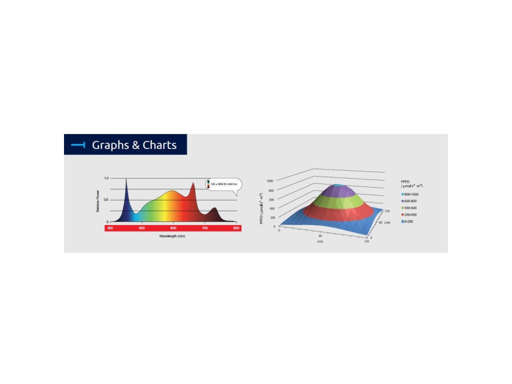 - Účinnost svítidla při použití příkonu LED (190W): 2,6 μmol/J