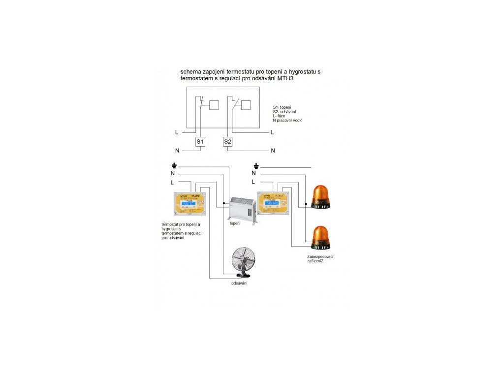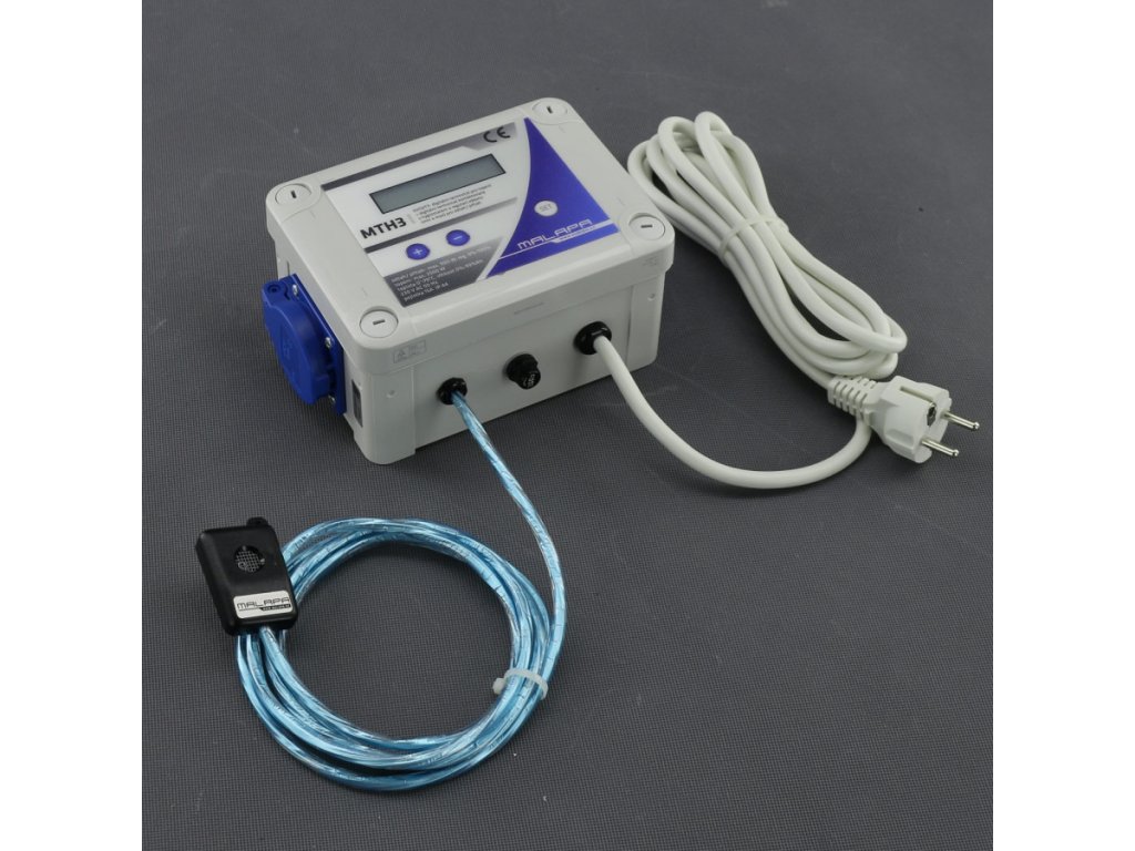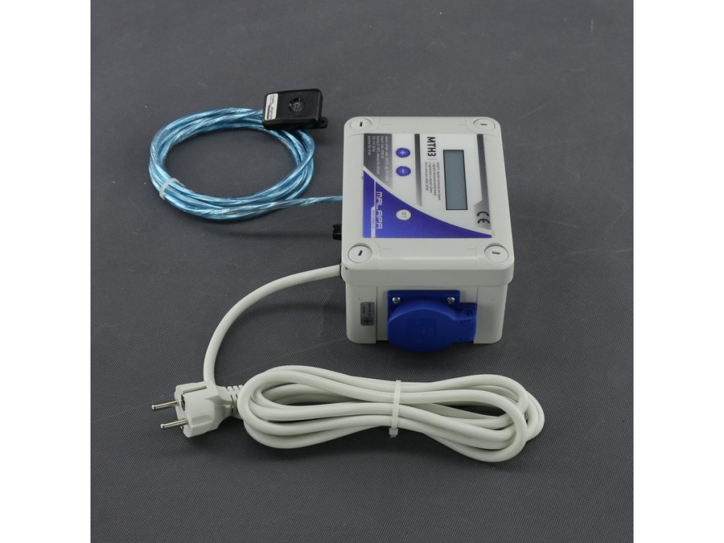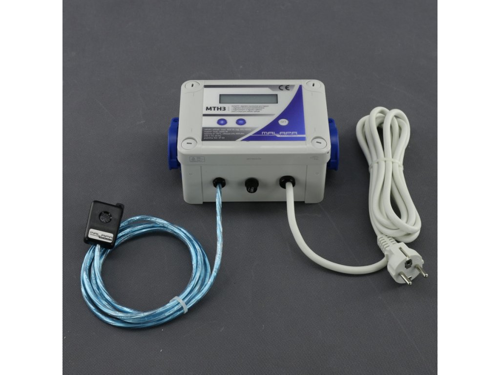 Kombinovaný termostat a hygrostat MTH3 s maximální zátěží 2600 W, nastavitelnou hysterezí a digitálním teplotním čidlem.