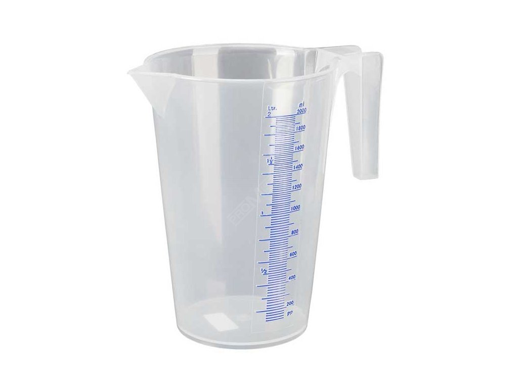 Plastová laboratorní odměrka s nálevkou o objemu 2000 ml, vhodná pro dávkování hnojiv a míchání v sudu.