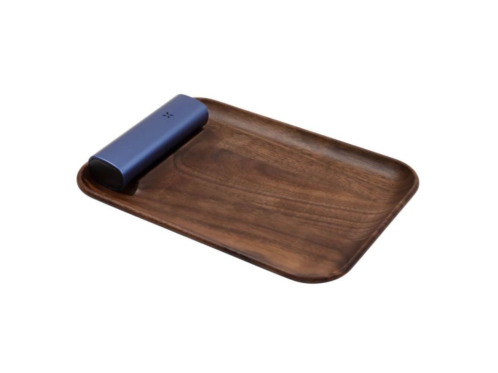 Dřevěný přípravný tácek s reliéfním logem PAX a místem pro zařízení. Udrží mletí, plnění i úklid na jednom místě.