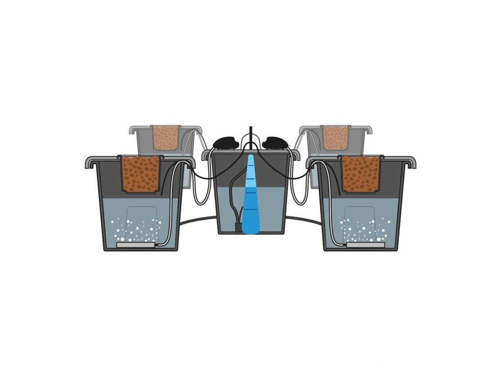 - Živný roztok je distribuován z hlavní nádrže s pomocí 2 vzduchových čerpadel