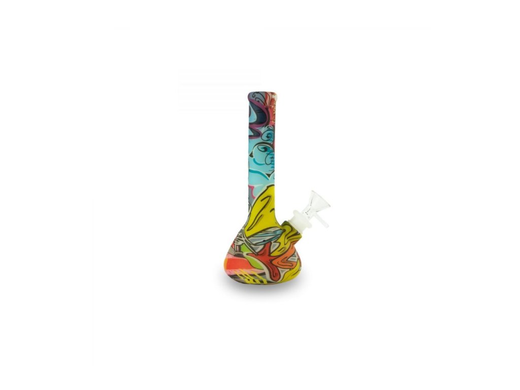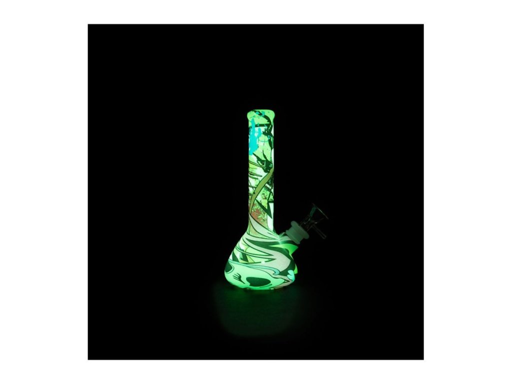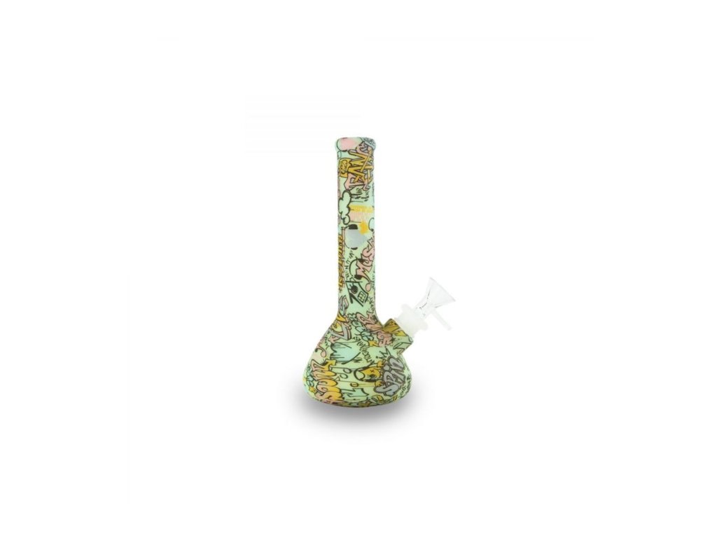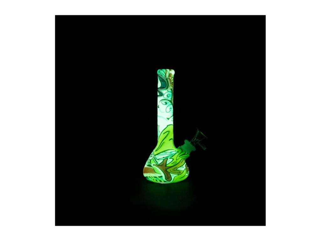 Fluorescent bong for extracts and essences, 19 cm high, available in various color combinations, with an illustrative image and surprise silicone extract case from Qnubu in various colors.