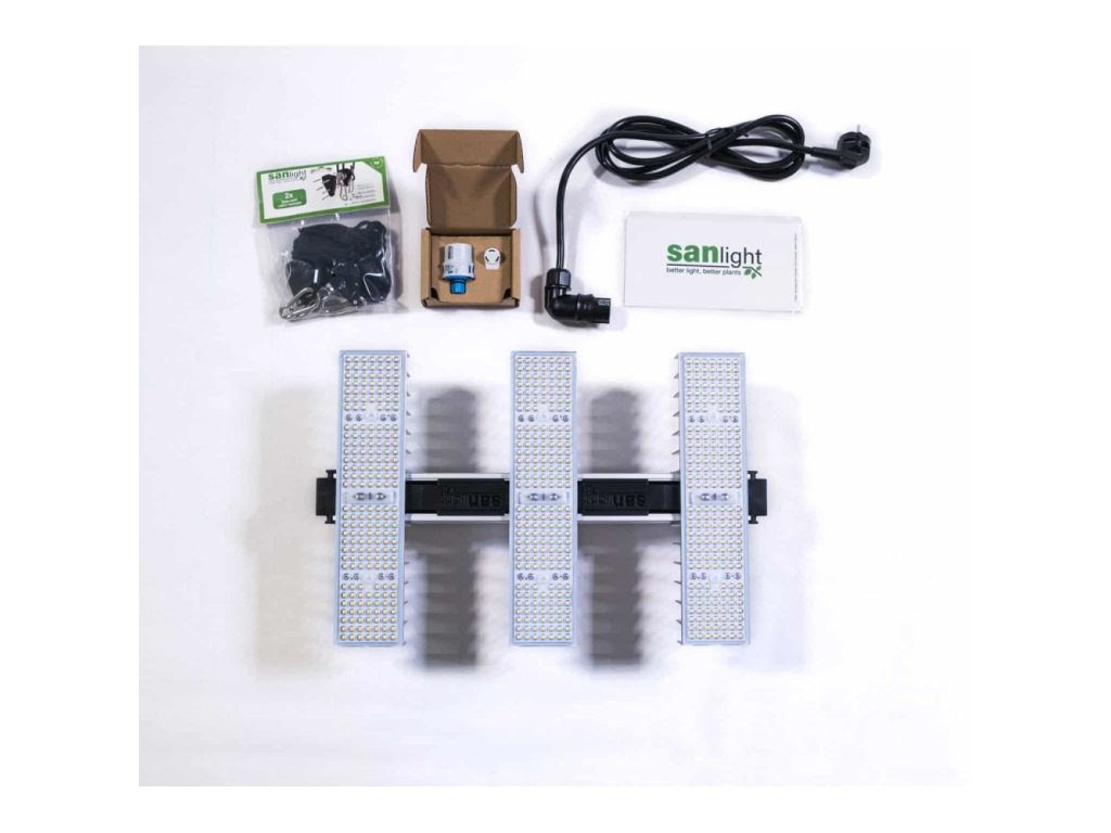 Jedná se o sadu svítidel SANlight EVO 3-60 200W V1.5 s příslušenstvím, které mají příkon 200W a fotonový tok PPF 545 μmol/s.