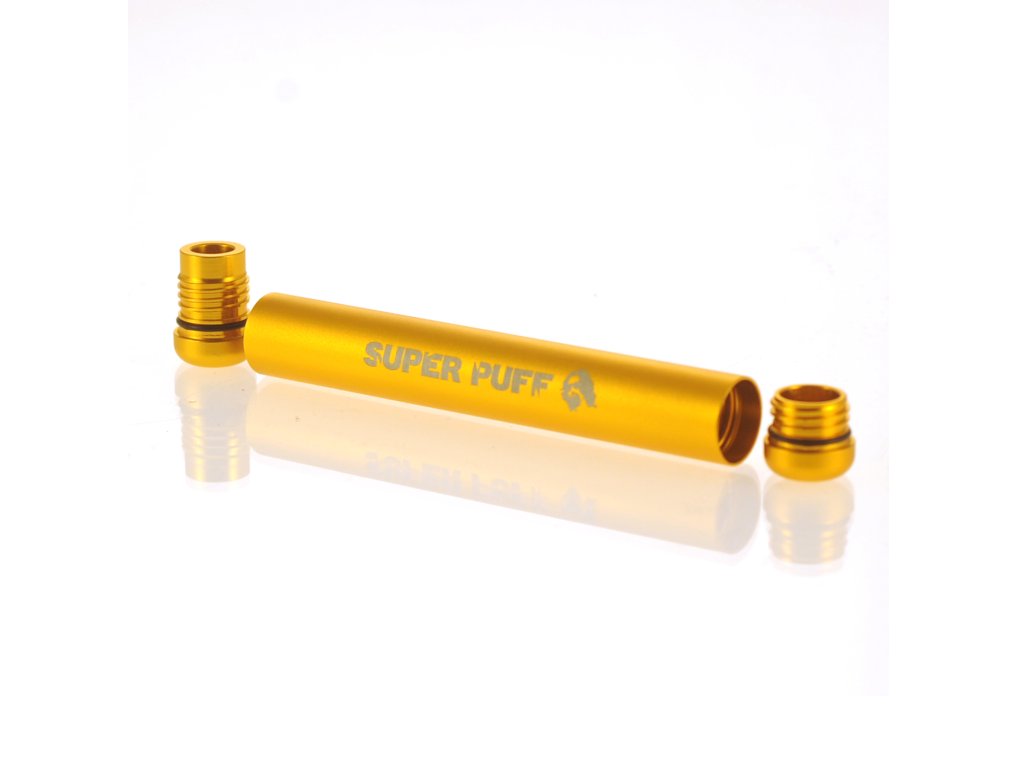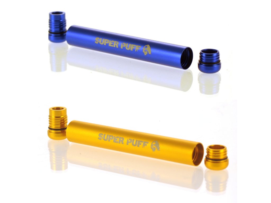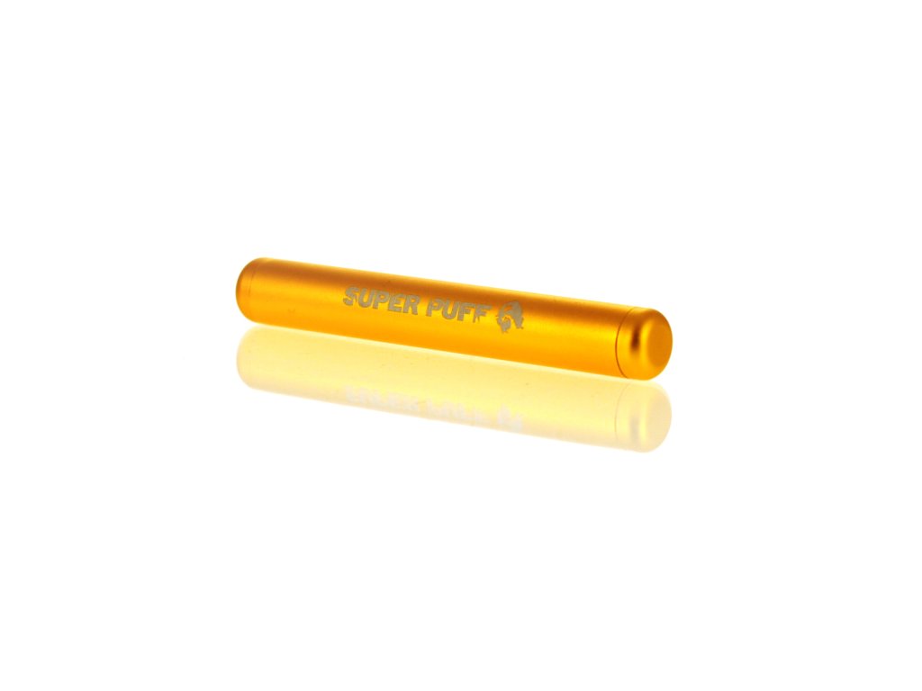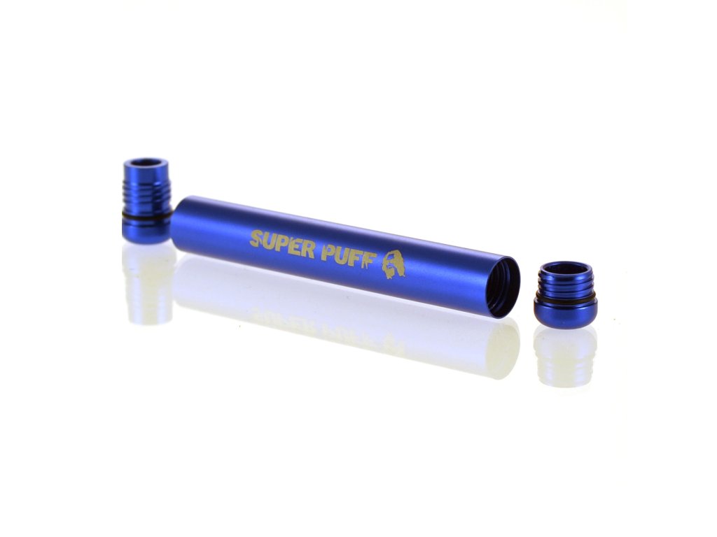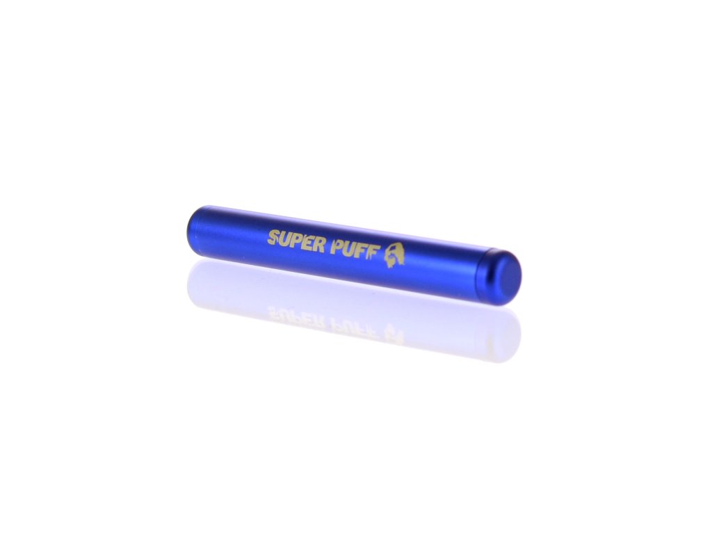 Hliníková krabička od firmy Super Puff má délku 115mm, průměr 15mm a váží 23g, k dispozici je v modré nebo zlaté barvě.