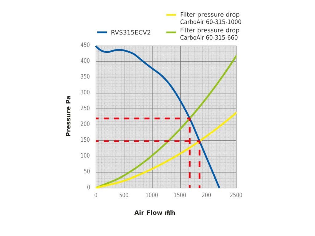 - Max. průtok vzduchu s filtrem: 1550 m3/h (s CarboAir 60, 315 mm)
