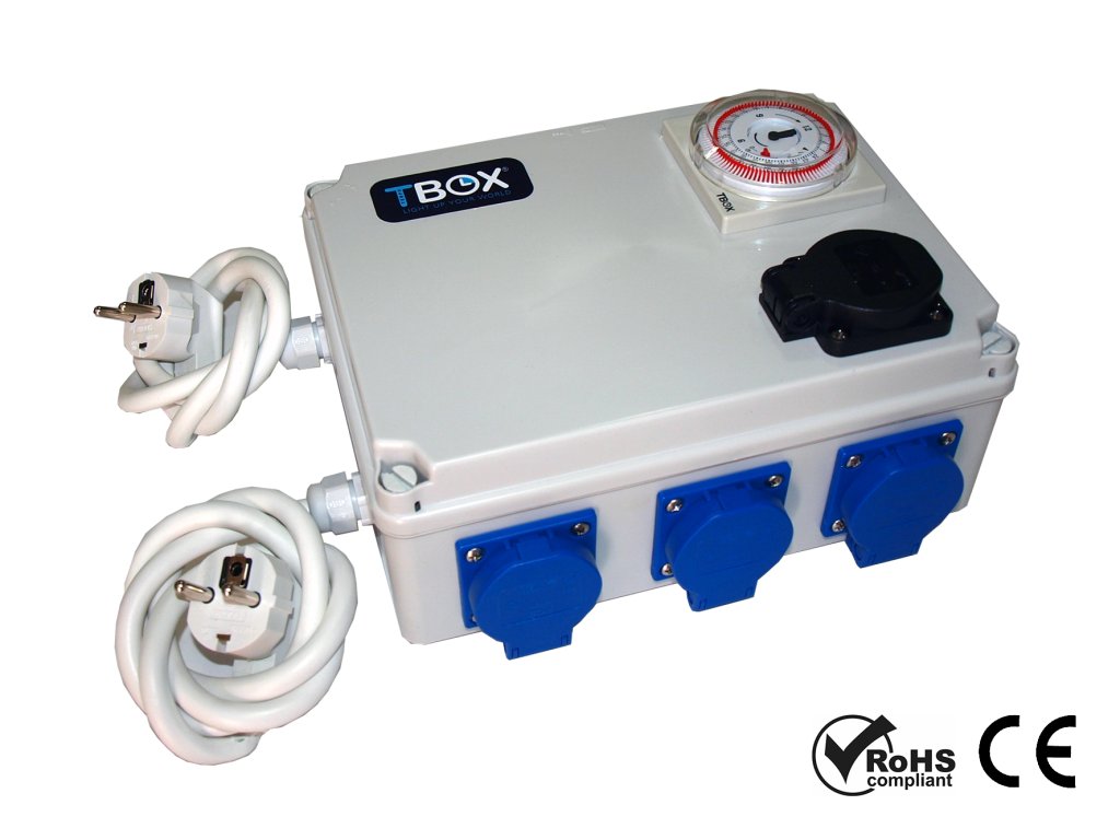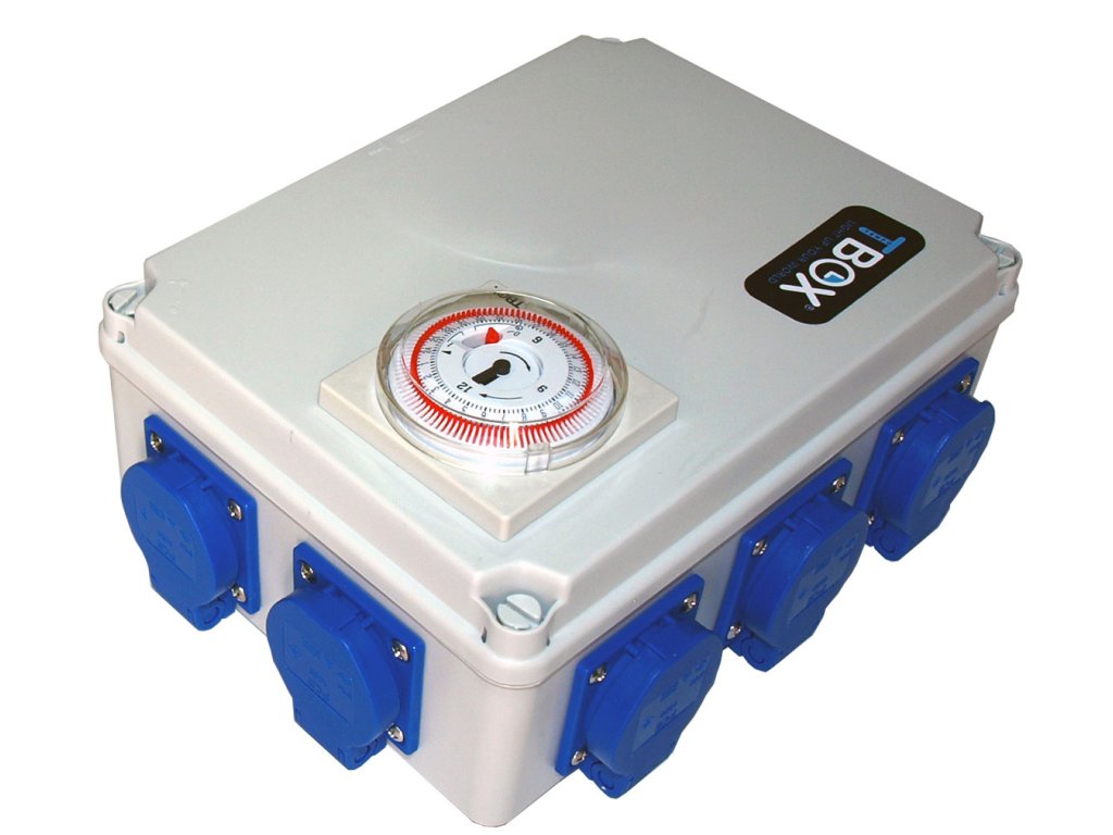 - Timer Box 8 bez topení má napětí 230V, 50Hz a maximální výkon jedné zásuvky je 2520W