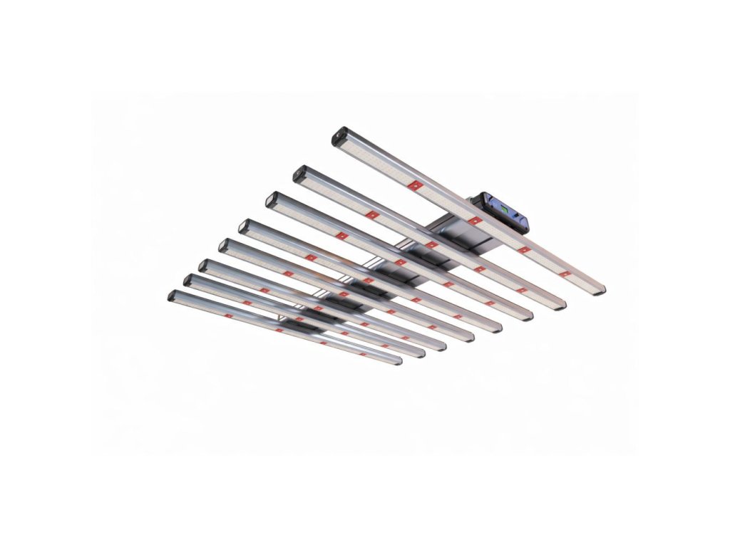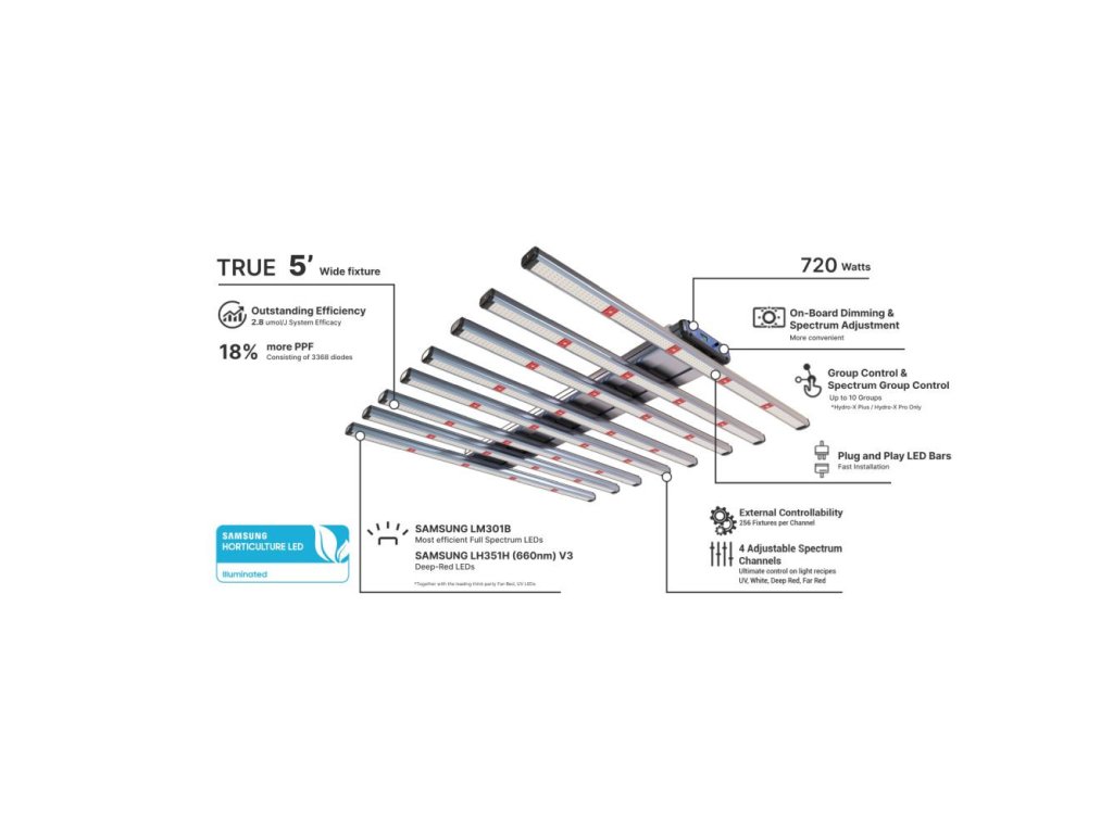 Model-H Plus je skutečné LED pěstební svítidlo o šířce 5 stop, navržené pro použití ve vnitřních pěstebních místnostech s vysokými nároky na PPFD, zejména pro vertikální zemědělství. Svítidlo obsahuje celkem 3368 vysoce účinných špičkových diod s celkovým příkonem navýšeným na 720 W, což přináší o 18 % vyšší PPF výkon. Uživatelé mohou využít integrované stmívání nebo upravovat spektrum a intenzitu světla propojením svítidel s řídicí jednotkou. Čtyři spektrální kanály – UV, bílý (plné spektrum), hluboká červená a daleká červená – jsou plně regulovatelné, což umožňuje přizpůsobit spektrum světla konkrétním potřebám rostlin (funkce dostupná pouze s řídicími jednotkami TrolMaster HCS-2/HCS-3). Patentovaný systém světelných lišt typu plug-and-play zároveň zajišťuje snadnou instalaci a usnadňuje budoucí údržbu.