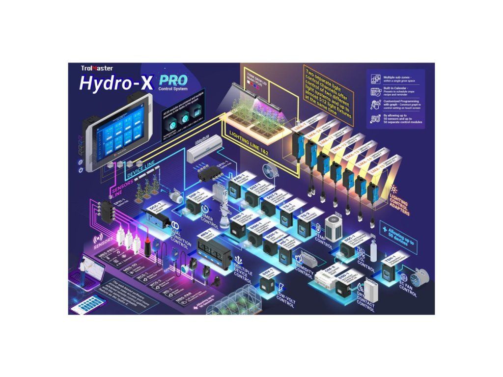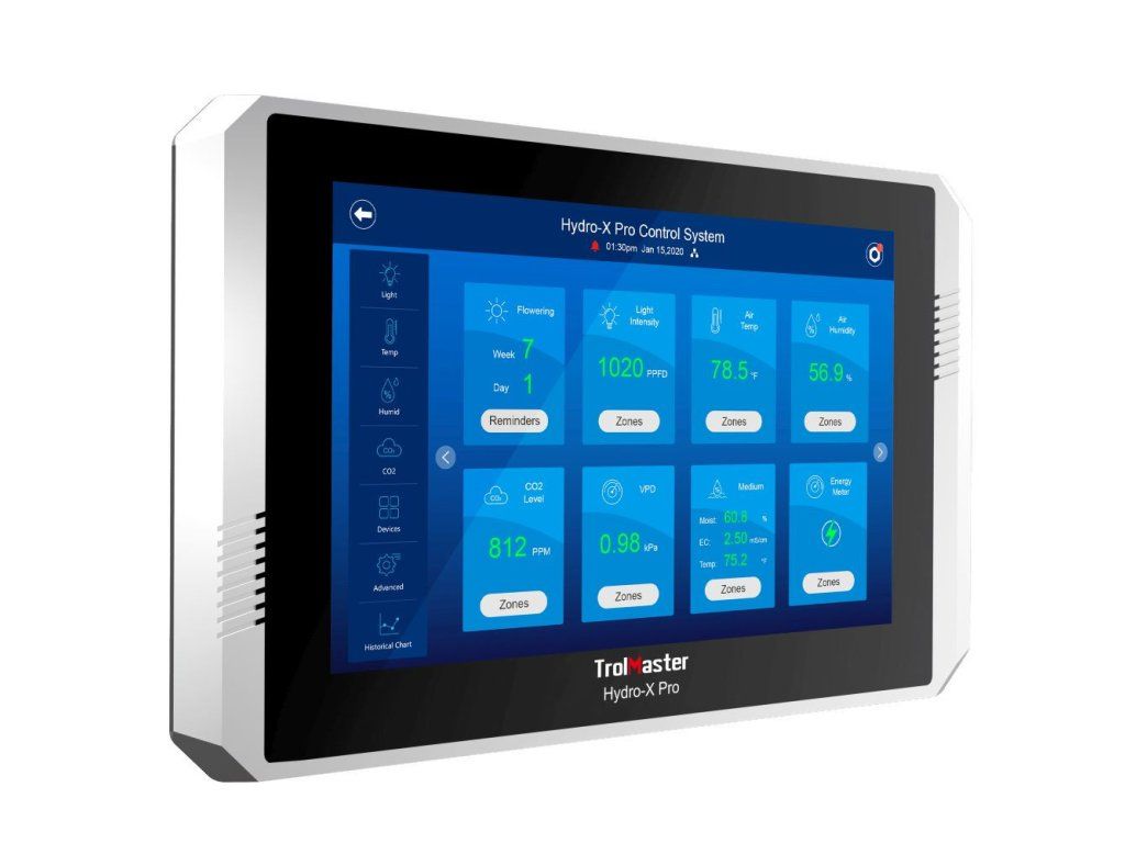 TrolMaster Hydro-X Pro je revoluční systém ovládání s dotykovým displejem, možností propojení 50 čidel a 50 řídicích modulů a vestavěným kalendářem.
