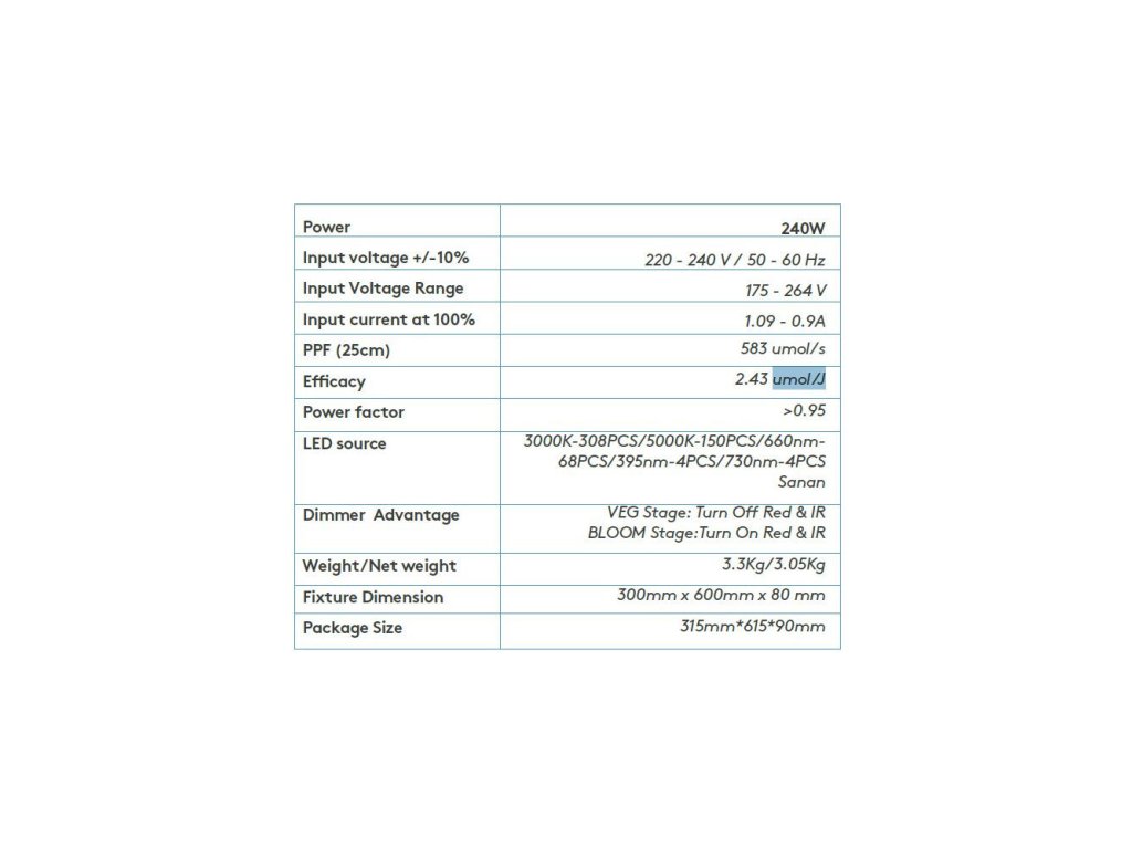 Pěstební osvětlení Vanguard Hydroponics COSMOS LED Board 240W pro plochu 100x100 cm. Účinnost 2.43 µmol/J. PPF 583 µmol/s (25 cm nad vrcholky rostlin).Doplňkové parametry